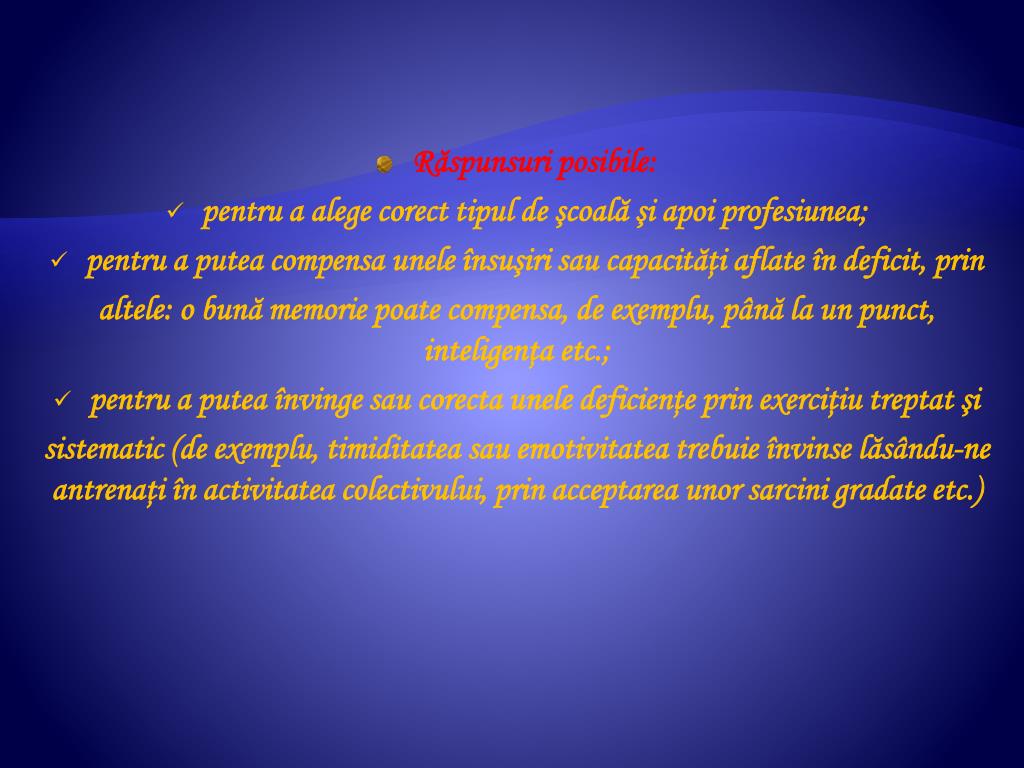Răspunsuriposibile: • pentru a alegecorecttipul de şcoalăşiapoiprofesiunea; • pentru a puteacompensauneleînsuşirisaucapacităţiaflateîn deficit, prin altele: o bunămemoriepoatecompensa, de exemplu, până la un punct, inteligenţa etc.; • pentru a puteaînvingesaucorectauneledeficienţe prinexerciţiutreptatşi sistematic (de exemplu, timiditateasauemotivitateatrebuieînvinse lăsându-ne antrenaţiîn activitateacolectivului, prinacceptareaunorsarcini gradate etc.)
