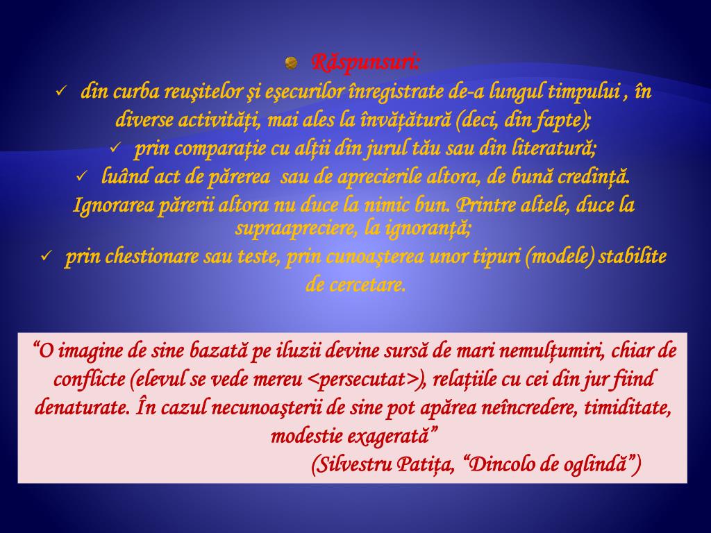 Răspunsuri: • din curbareuşitelorşi eşecurilorînregistrate de-a lungultimpului , în diverse activităţi, mai ales la învăţătură (deci, din fapte); • princomparaţie cu alţii din jurul tău sau din literatură; • luând act de părereasau de aprecierilealtora, de bunăcredinţă. Ignorarea păreriialtora nu duce la nimic bun. Printrealtele, duce la supraapreciere, la ignoranţă; • princhestionaresauteste, princunoaştereaunortipuri (modele) stabilite de cercetare. “O imagine de sine bazatăpeiluziidevinesursă de marinemulţumiri, chiar de conflicte (elevul se vedemereu<persecutat>), relaţiile cu cei din jurfiinddenaturate. În cazulnecunoaşterii de sine pot apărea neîncredere, timiditate, modestieexagerată” (SilvestruPatiţa, “Dincolo de oglindă”)
