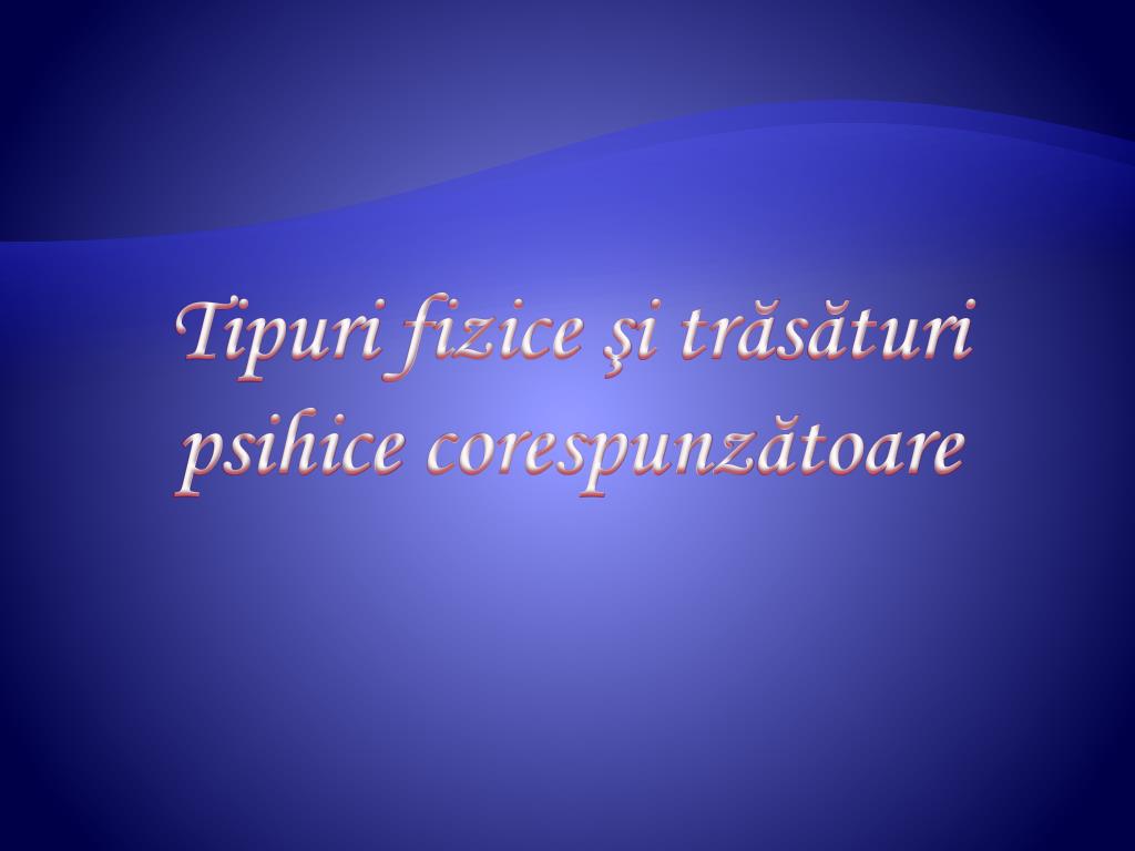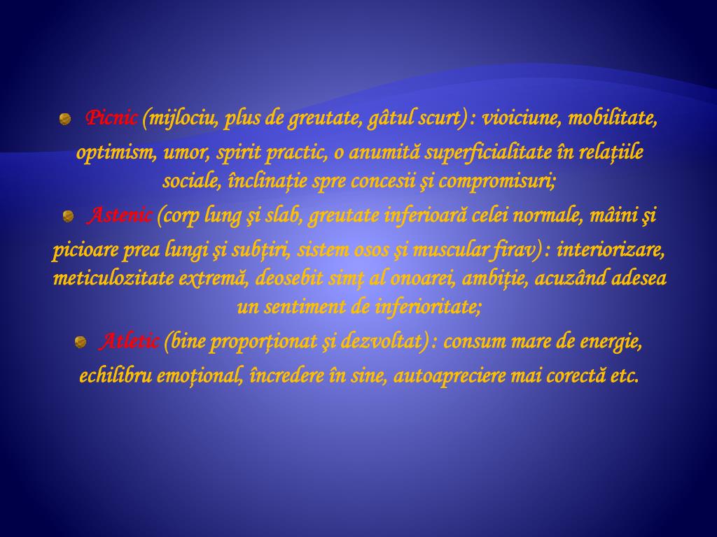 Picnic (mijlociu, plus de greutate, gâtulscurt) : vioiciune, mobilitate, optimism, umor, spirit practic, o anumităsuperficialitateîn relaţiilesociale, înclinaţiespreconcesiişicompromisuri; • Astenic (corp lung şi slab, greutateinferioarăceleinormale, mâinişi picioareprea lungi şi subţiri, sistemososşi muscular firav) : interiorizare, meticulozitateextremă, deosebitsimţ al onoarei, ambiţie, acuzândadesea un sentiment de inferioritate; • Atletic (bine proporţionatşidezvoltat) : consum mare de energie, echilibruemoţional, încredereîn sine, autoaprecieremaicorectă etc.