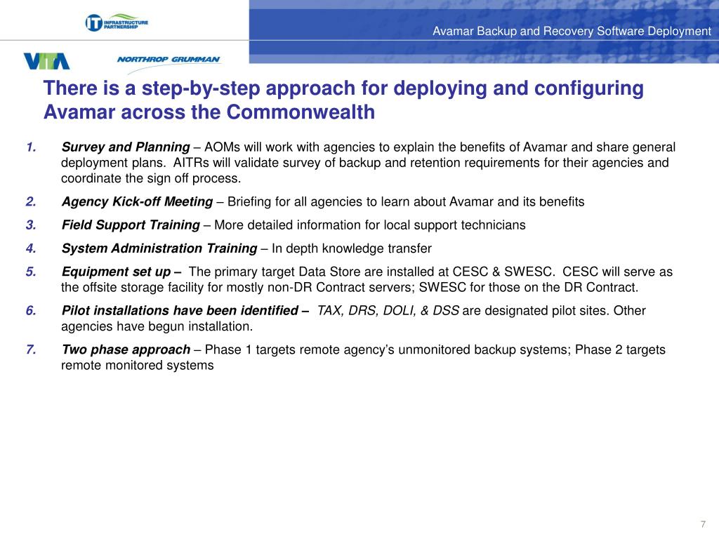 There is a step-by-step approach for deploying and configuring Avamar across the Commonwealth Survey and Planning – AOMs will work with agencies to explain the benefits of Avamar and share general deployment plans. AITRs will validate survey of backup and retention requirements for their agencies and coordinate the sign off process. Agency Kick-off Meeting – Briefing for all agencies to learn about Avamar and its benefits Field Support Training – More detailed information for local support technicians System Administration Training – In depth knowledge transfer Equipment set up –The primary target Data Store are installed at CESC & SWESC. CESC will serve as the offsite storage facility for mostly non-DR Contract servers; SWESC for those on the DR Contract. Pilot installations have been identified – TAX, DRS, DOLI, & DSS are designated pilot sites. Other agencies have begun installation. Two phase approach – Phase 1 targets remote agency’s unmonitored backup systems; Phase 2 targets remote monitored systems