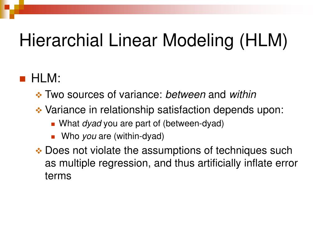 Hierarchial Linear Modeling (HLM) • HLM: • Two sources of variance: between and within • Variance in relationship satisfaction depends upon: • What dyad you are part of (between-dyad) • Who you are (within-dyad) • Does not violate the assumptions of techniques such as multiple regression, and thus artificially inflate error terms