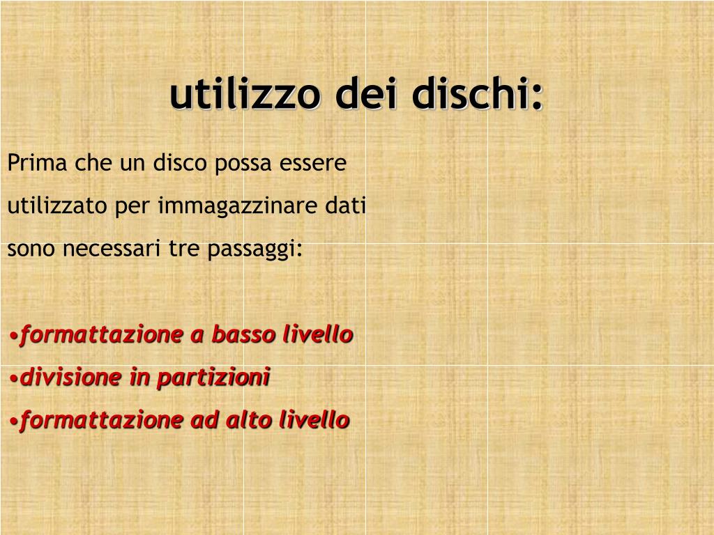 utilizzo dei dischi: • Prima che un disco possa essere • utilizzato per immagazzinare dati • sono necessari tre passaggi: • formattazione a basso livello • divisione in partizioni • formattazione ad alto livello