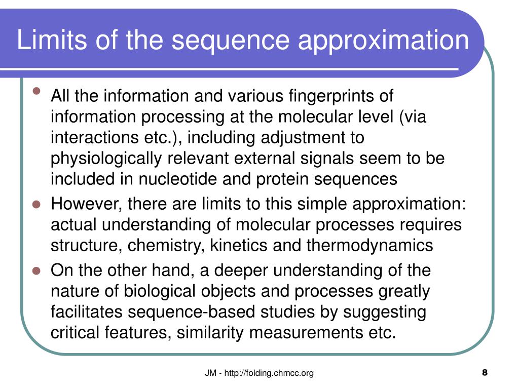 Limits of the sequence approximation • All the information and various fingerprints of information processing at the molecular level (via interactions etc.), including adjustment to physiologically relevant external signals seem to be included in nucleotide and protein sequences • However, there are limits to this simple approximation: actual understanding of molecular processes requires structure, chemistry, kinetics and thermodynamics • On the other hand, a deeper understanding of the nature of biological objects and processes greatly facilitates sequence-based studies by suggesting critical features, similarity measurements etc. JM - http://folding.chmcc.org