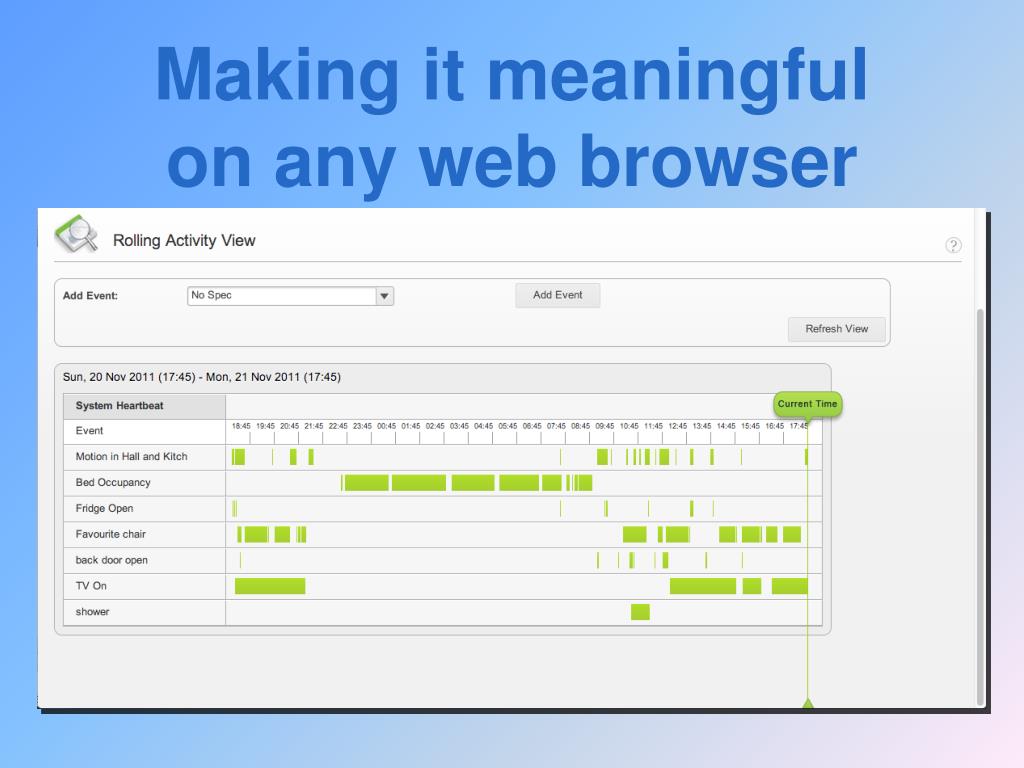 Collecting the data • Motion • Room temp OK • Fridge door open or closed • Lights switched on or off • Bed & chair occupancy • Doors & windows open or closed • Heating boiler running or off • Oven or hob in use or not • Shower & bath in use or not • Television on • Enuresis sensor