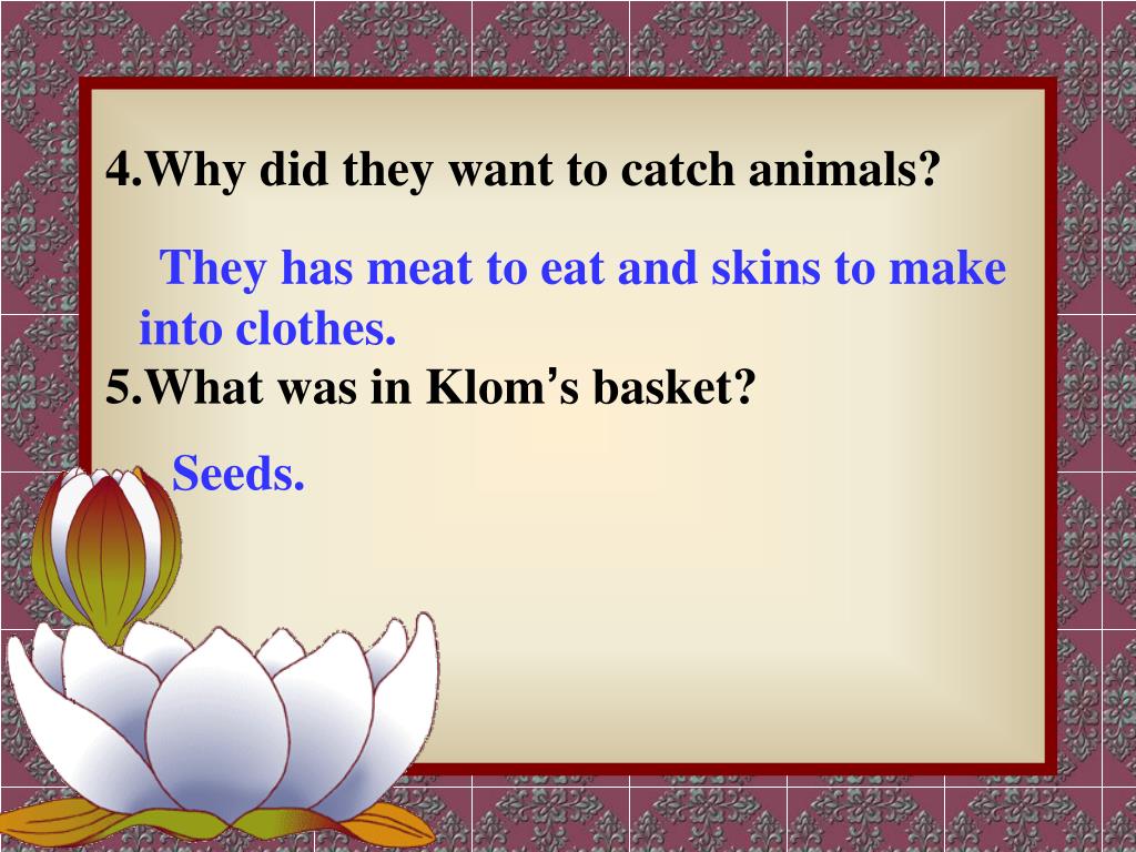 They has meat to eat and skins to make into clothes. Seeds. 4.Why did they want to catch animals? 5.What was in Klom’s basket?