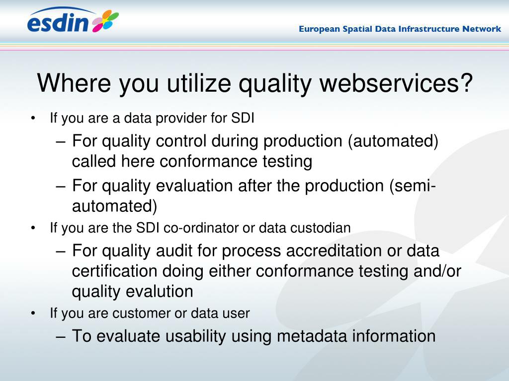 Where you utilize quality webservices? • If you are a data provider for SDI • For quality control during production (automated) called here conformance testing • For quality evaluation after the production (semi-automated) • If you are the SDI co-ordinator or data custodian • For quality audit for process accreditation or data certification doing either conformance testing and/or quality evalution • If you are customer or data user • To evaluate usability using metadata information