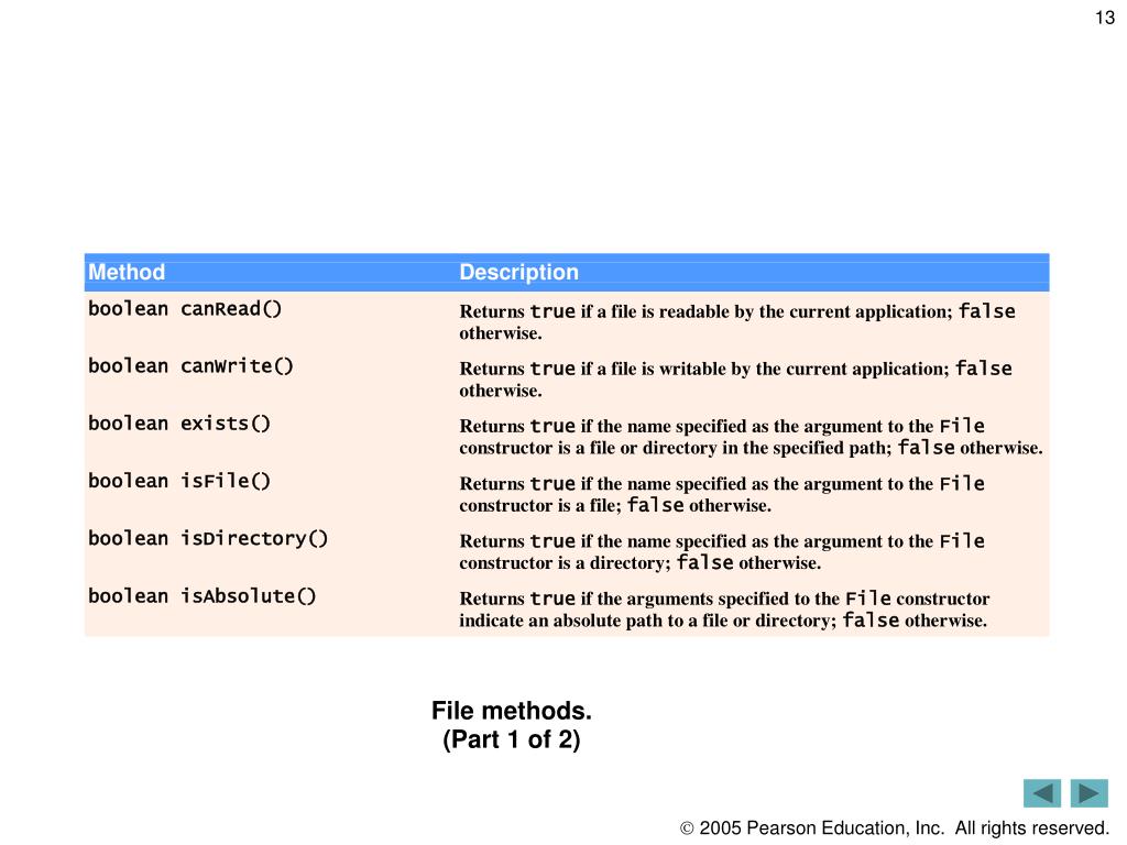 Create new File object; user specifies file name and path Returns true if file or directory specified exists Retrieve name of file or directory Retrieve path entered as a string Returns true if name is a file, not a directory Returns true if name is a directory, not a file Returns true if path was an absolute path Retrieve time file or directory was last modified (system-dependent value) Retrieve length of file in bytes Retrieve parent directory (path where File object’s file or directory can be found) Retrieve absolute path of file or directory Outline FileDemonstration .java (1 of 2)