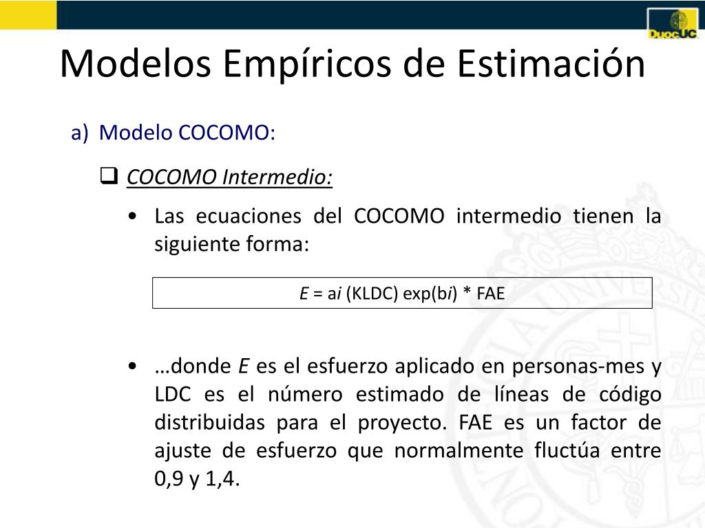 Modelos Empíricos de Estimación Modelo COCOMO: • COCOMO Intermedio: • Las ecuaciones del COCOMO intermedio tienen la siguiente forma: E = ai (KLDC) exp(bi) * FAE • …donde E es el esfuerzo aplicado en personas-mes y LDC es el número estimado de líneas de código distribuidas para el proyecto. FAE es un factor de ajuste de esfuerzo que normalmente fluctúa entre 0,9 y 1,4.