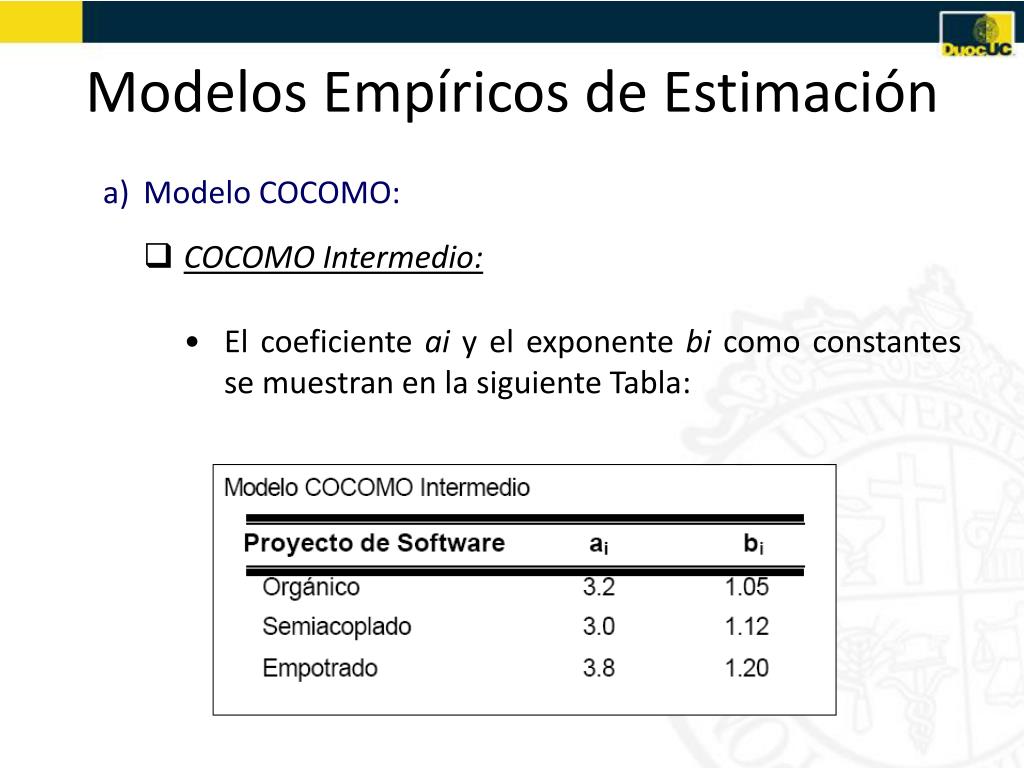 Modelos Empíricos de Estimación Modelo COCOMO: • COCOMO Intermedio: • El coeficiente ai y el exponente bi como constantes se muestran en la siguiente Tabla: