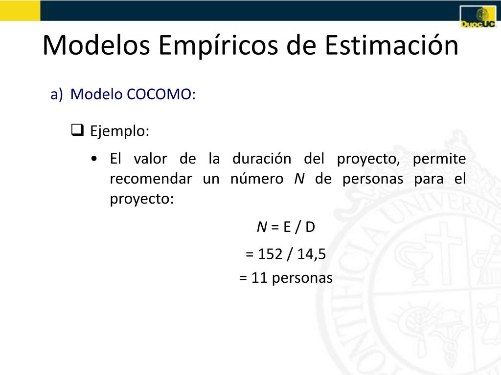 Modelos Empíricos de Estimación Modelo COCOMO: • Ejemplo: • El valor de la duración del proyecto, permite recomendar un número N de personas para el proyecto: N = E / D = 152 / 14,5 = 11 personas