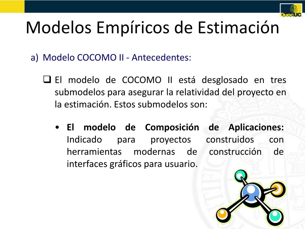 Modelos Empíricos de Estimación Modelo COCOMO II - Antecedentes: • El modelo de COCOMO II está desglosado en tres submodelos para asegurar la relatividad del proyecto en la estimación. Estos submodelos son: • El modelo de Composición de Aplicaciones: Indicado para proyectos construidos con herramientas modernas de construcción de interfaces gráficos para usuario.