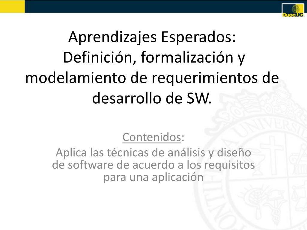 Aprendizajes Esperados: Definición, formalización y modelamiento de requerimientos de desarrollo de SW. Contenidos: Aplica las técnicas de análisis y diseño de software de acuerdo a los requisitos para una aplicación