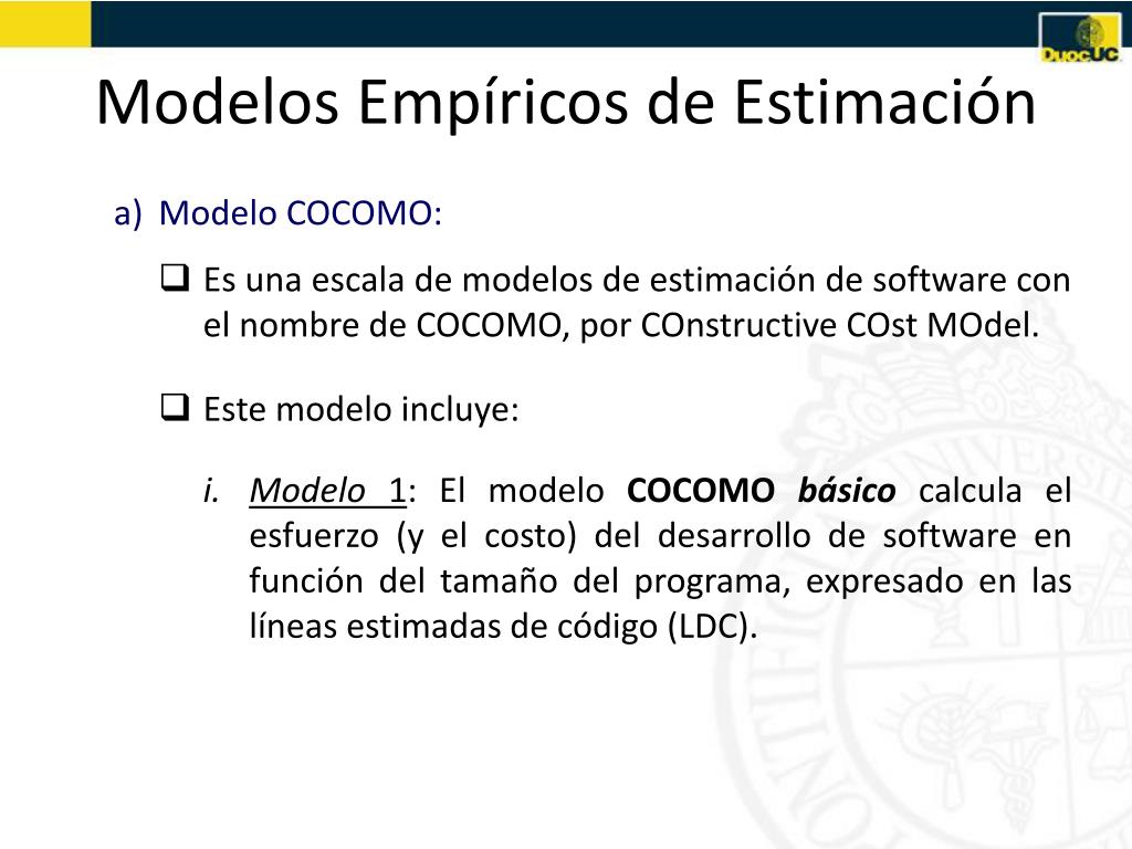 Modelos Empíricos de Estimación Modelo COCOMO: • Es una escala de modelos de estimación de software con el nombre de COCOMO, por COnstructiveCOstMOdel. • Este modelo incluye: • Modelo 1: El modelo COCOMO básicocalcula el esfuerzo (y el costo) del desarrollo de software en función del tamaño del programa, expresado en las líneas estimadas de código (LDC).