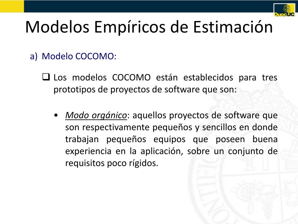 Modelos Empíricos de Estimación Modelo COCOMO: • Los modelos COCOMO están establecidos para tres prototipos de proyectos de software que son: • Modo orgánico: aquellos proyectos de software que son respectivamente pequeños y sencillos en donde trabajan pequeños equipos que poseen buena experiencia en la aplicación, sobre un conjunto de requisitos poco rígidos.