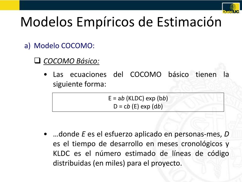 Modelos Empíricos de Estimación Modelo COCOMO: • COCOMO Básico: • Las ecuaciones del COCOMO básico tienen la siguiente forma: E = ab (KLDC) exp (bb) D = cb(E) exp (db) • …donde E es el esfuerzo aplicado en personas-mes, D es el tiempo de desarrollo en meses cronológicos y KLDC es el número estimado de líneas de código distribuidas (en miles) para el proyecto.