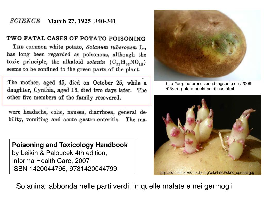 March 27, 1925 340-341 http://depthofprocessing.blogspot.com/2009 /05/are-potato-peels-nutritious.html Poisoning and Toxicology Handbook by Leikin & Paloucek 4th edition, Informa Health Care, 2007 ISBN 1420044796, 9781420044799 http://commons.wikimedia.org/wiki/File:Potato_sprouts.jpg Solanina: abbonda nelle parti verdi, in quelle malate e nei germogli