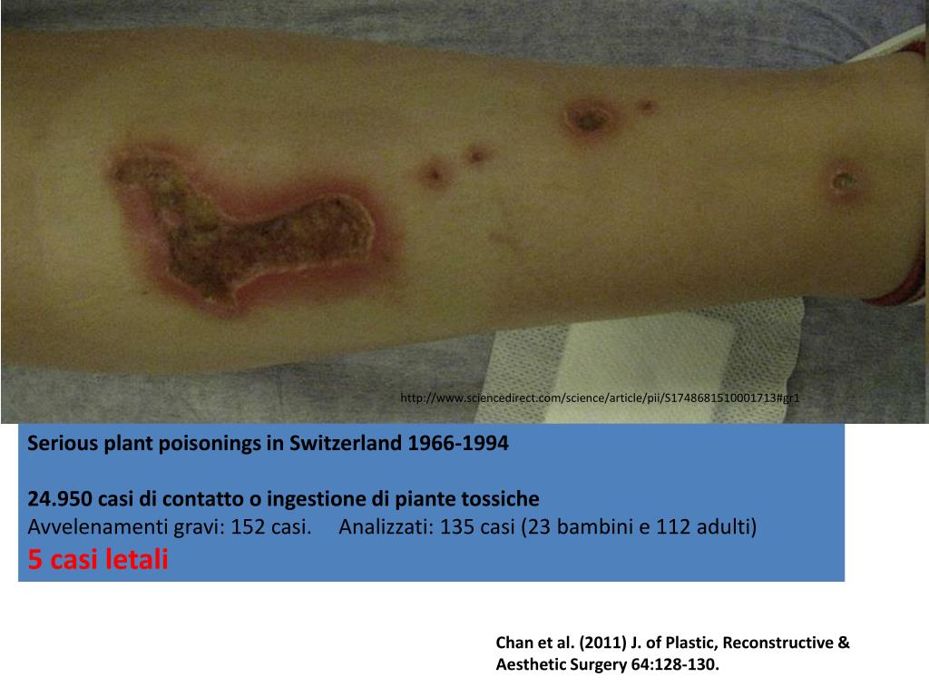 http://www.sciencedirect.com/science/article/pii/S1748681510001713#gr1http://www.sciencedirect.com/science/article/pii/S1748681510001713#gr1 Serious plant poisonings in Switzerland 1966-1994 24.950 casi di contatto o ingestione di piante tossiche Avvelenamenti gravi: 152 casi. Analizzati: 135 casi (23 bambini e 112 adulti) 5 casi letali Chan et al. (2011) J. of Plastic, Reconstructive & Aesthetic Surgery 64:128-130.