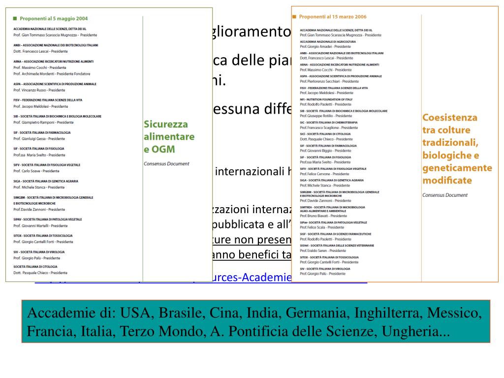 Le biotecnologie e il miglioramento classico lavorano sui geni. • La modificazione genetica delle piante da parte dell’uomo va avanti da più di 10.000 anni. • Nessuna opposizione, nessuna differenza cruciale Le principali accademie nazionali e internazionali hanno espresso pareri positivi sulla tecnologia. Molte società scientifiche e organizzazioni internazionali (OMS, FAO) hanno concluso che in base all’evidenza scientifica pubblicata e all’esperienze accumulate in tanti anni di coltivazione commerciale, le colture non presentano rischi nuovi o differenti rispetto a quelle convenzionali e danno benefici tangibili. (per una lista incompleta) http://users.unimi.it/morandin/Sources-Academies-societies.doc Accademie di: USA, Brasile, Cina, India, Germania, Inghilterra, Messico, Francia, Italia, Terzo Mondo, A. Pontificia delle Scienze, Ungheria...