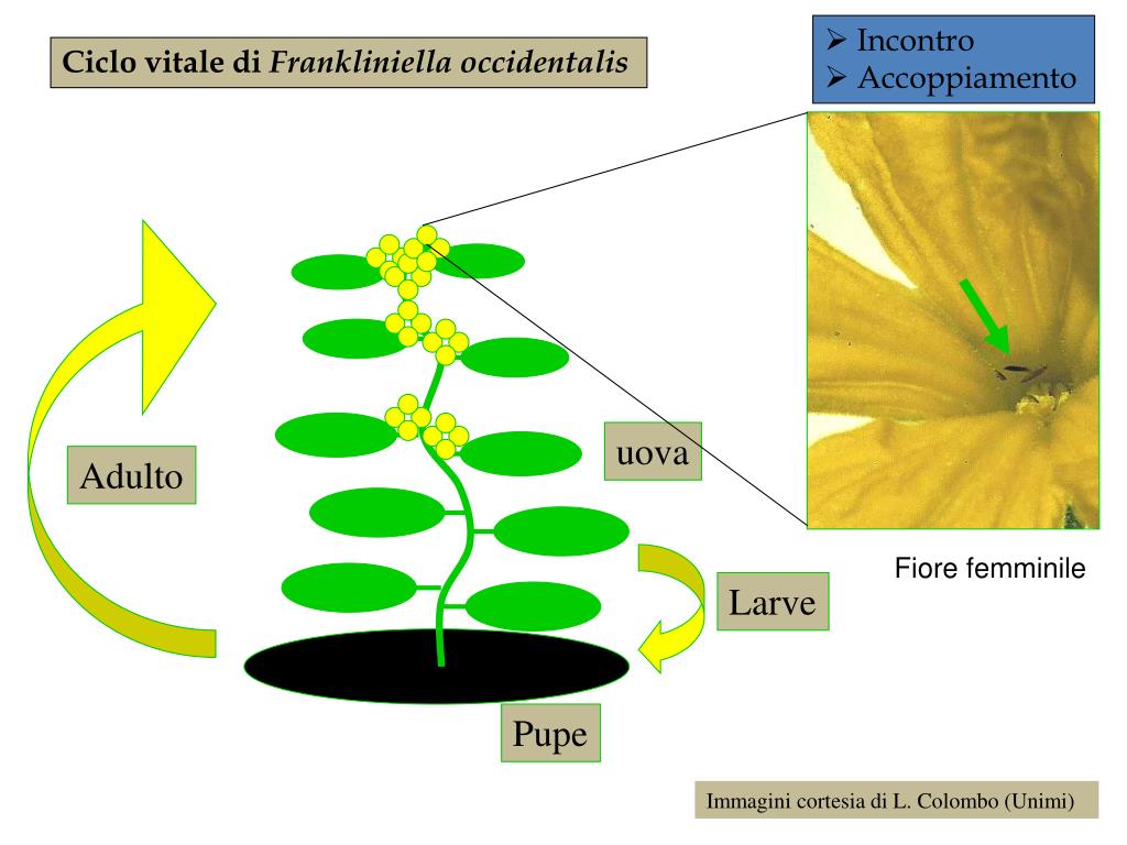 Fiore femminile • Incontro • Accoppiamento Ciclovitale di Frankliniellaoccidentalis uova Adulto Larve Pupe Immagini cortesia di L. Colombo (Unimi)