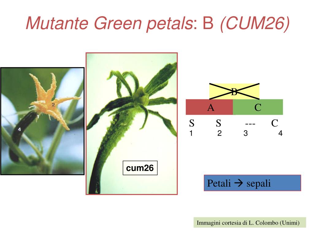 Mutante Green petals: B (CUM26) B A C S S --- C 1 2 3 4 cum26 Petali sepali Immagini cortesia di L. Colombo (Unimi)