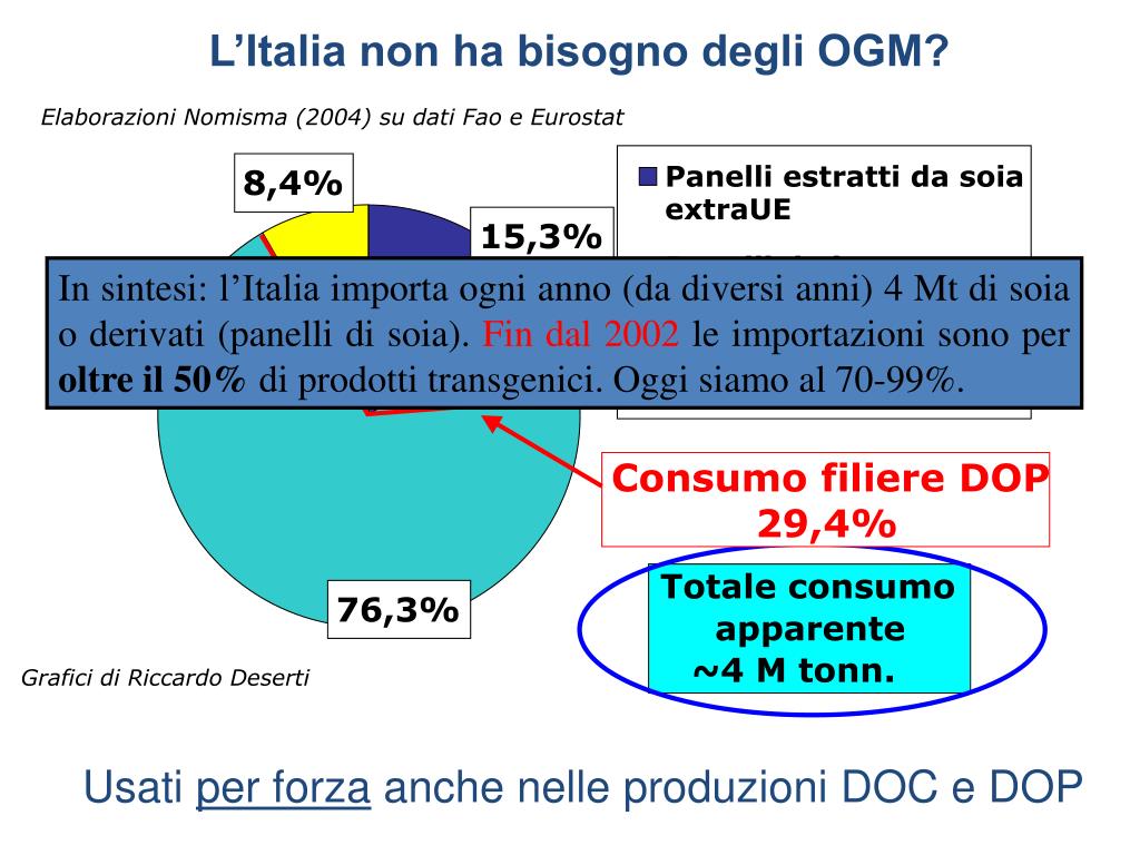 Elaborazioni Nomisma (2004) su dati Fao e Eurostat Panelli estratti da soia 8,4% extraUE 15,3% Panelli da import extraUE Panelli estratti da soia italiana o UE Consumo filiere DOP 29,4% Totale consumo 76,3% apparente ~4 M tonn. Grafici di Riccardo Deserti L’Italia non ha bisogno degli OGM? In sintesi: l’Italia importa ogni anno (da diversi anni) 4 Mt di soia o derivati (panelli di soia). Fin dal 2002 le importazioni sono per oltre il 50% di prodotti transgenici. Oggi siamo al 70-99%. Usati per forza anche nelle produzioni DOC e DOP