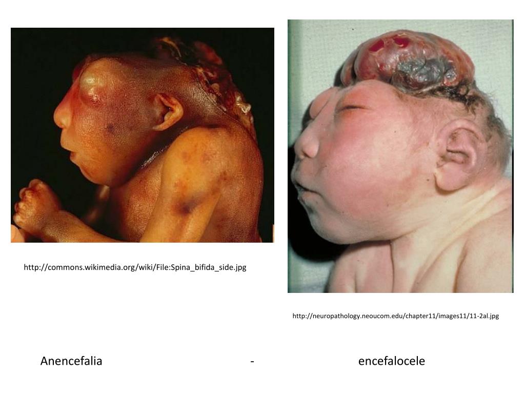 http://commons.wikimedia.org/wiki/File:Spina_bifida_side.jpg http://neuropathology.neoucom.edu/chapter11/images11/11-2al.jpg Anencefalia - encefalocele