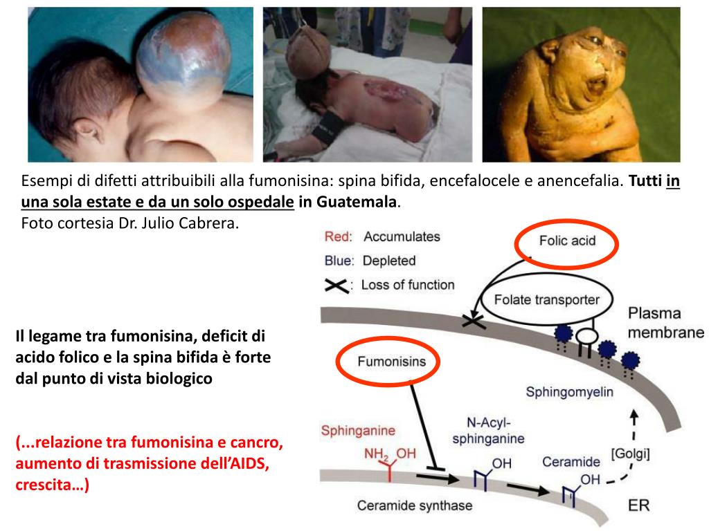 Esempi di difetti attribuibili alla fumonisina: spina bifida, encefalocele e anencefalia. Tutti in una sola estate e da un solo ospedale in Guatemala. Foto cortesia Dr. Julio Cabrera. Il legame tra fumonisina, deficit di acido folico e la spina bifida è forte dal punto di vista biologico (...relazione tra fumonisina e cancro, aumento di trasmissione dell’AIDS, crescita…)