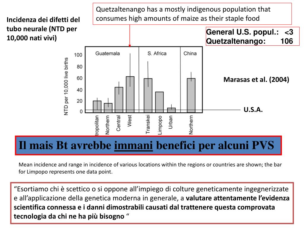 Quetzaltenango has a mostly indigenous population that consumes high amounts of maize as their staple food Incidenza dei difetti del tubo neurale (NTD per 10,000 nati vivi) General U.S. popul.: <3 Quetzaltenango: 106 Marasas et al. (2004) U.S.A. Il mais Bt avrebbe immani benefici per alcuni PVS Mean incidence and range in incidence of various locations within the regions or countries are shown; the bar for Limpopo represents one data point. “Esortiamo chi è scettico o si oppone all’impiego di colture geneticamente ingegnerizzate e all’applicazione della genetica moderna in generale, a valutare attentamente l’evidenza scientifica connessa e i danni dimostrabili causati dal trattenere questa comprovata tecnologia da chi ne ha più bisogno “