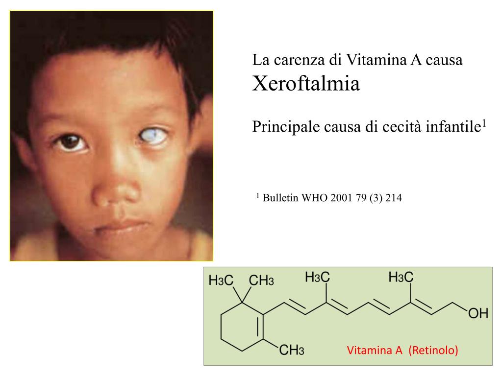 La carenza di Vitamina A causa Xeroftalmia Principale causa di cecità infantile1 1 Bulletin WHO 2001 79 (3) 214 Vitamina A (Retinolo)