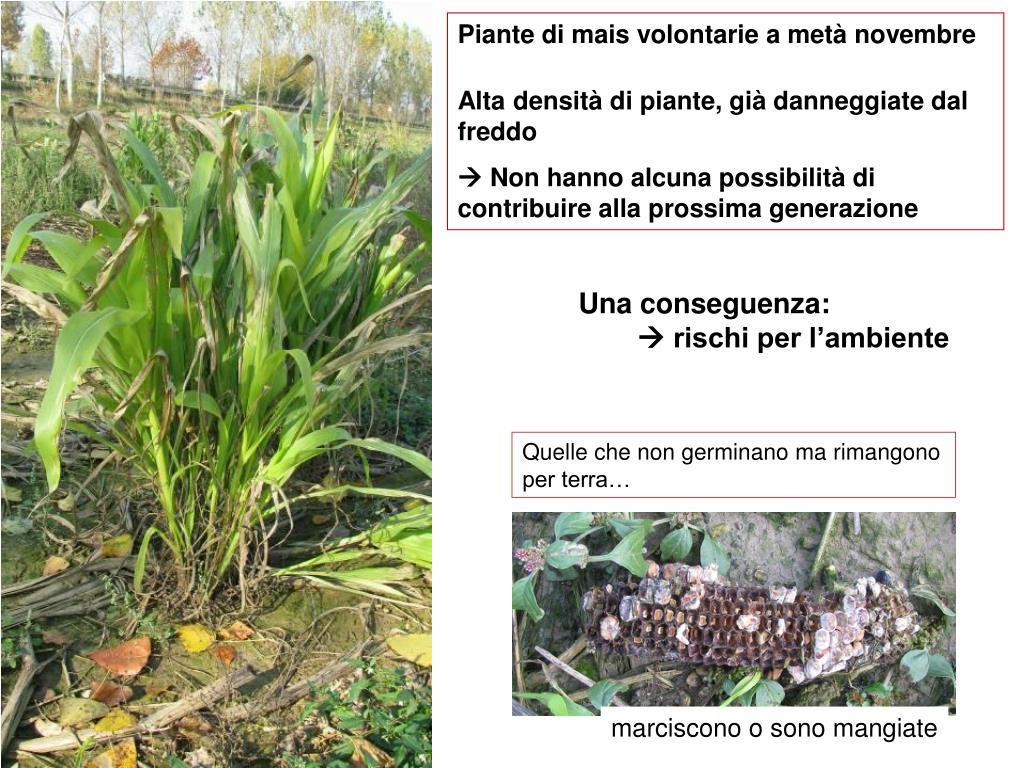 Piante di mais volontarie a metà novembre Alta densità di piante, già danneggiate dal freddo Non hanno alcuna possibilità di contribuire alla prossima generazione • Una conseguenza: • rischi per l’ambiente Quelle che non germinano ma rimangono per terra… marciscono o sono mangiate