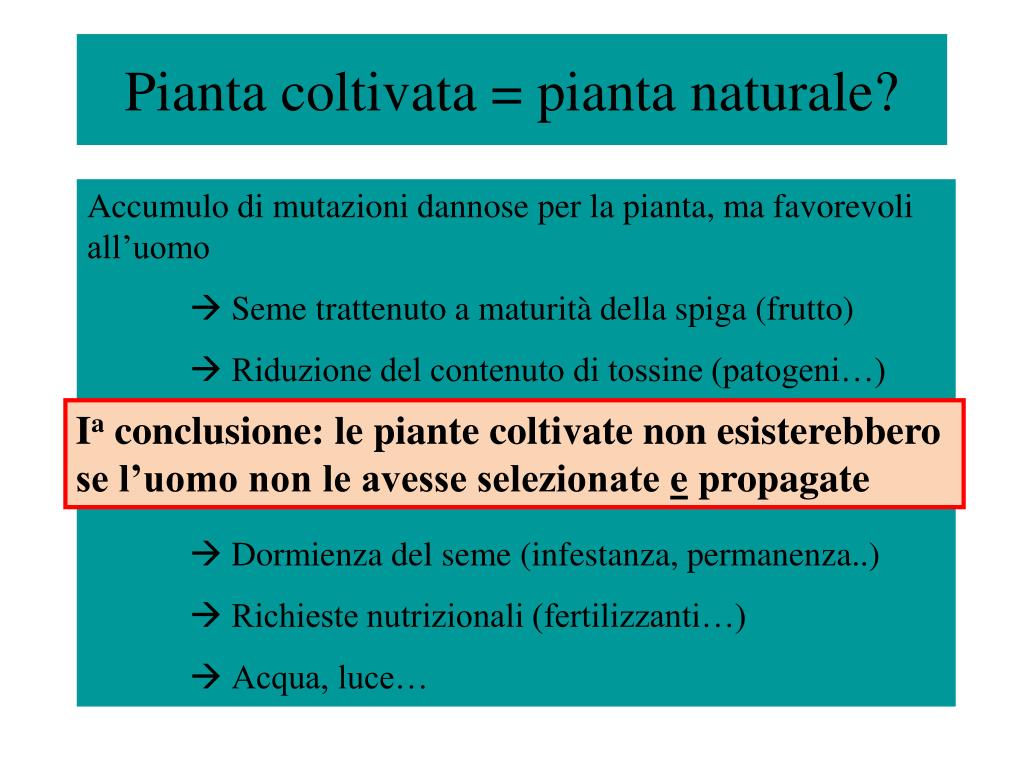 Pianta coltivata = pianta naturale? Accumulo di mutazioni dannose per la pianta, ma favorevoli all’uomo Seme trattenuto a maturità della spiga (frutto) Riduzione del contenuto di tossine (patogeni…) Dimensioni del frutto/seme/parte commestibile Nanismo/accestimento Dormienza del seme (infestanza, permanenza..) Richieste nutrizionali (fertilizzanti…) Acqua, luce… Iaconclusione: le piante coltivate non esisterebbero se l’uomo non le avesse selezionate e propagate
