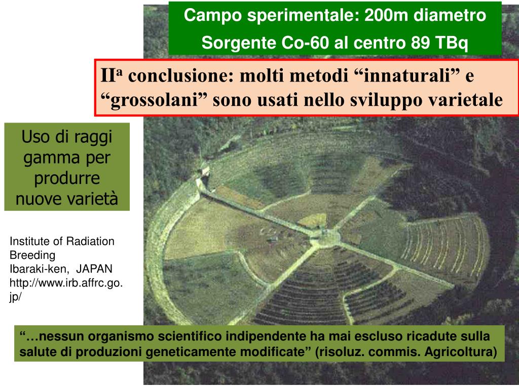Campo sperimentale: 200m diametro Sorgente Co-60 al centro 89 TBq IIaconclusione: molti metodi “innaturali” e “grossolani” sono usati nello sviluppo varietale Uso di raggi gamma per produrrenuovevarietà Institute of Radiation Breeding Ibaraki-ken, JAPAN http://www.irb.affrc.go.jp/ “…nessunorganismoscientificoindipendente ha maiesclusoricadutesulla salute di produzionigeneticamentemodificate” (risoluz. commis. Agricoltura)