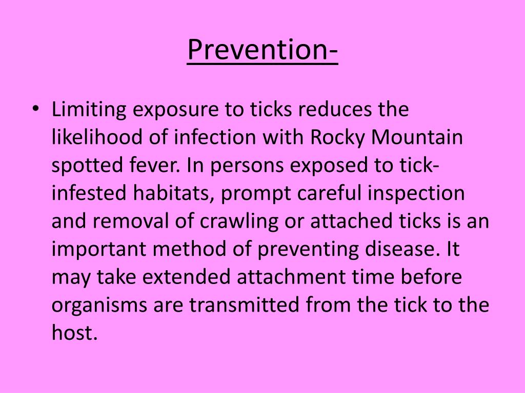 Prevention- • Limiting exposure to ticks reduces the likelihood of infection with Rocky Mountain spotted fever. In persons exposed to tick-infested habitats, prompt careful inspection and removal of crawling or attached ticks is an important method of preventing disease. It may take extended attachment time before organisms are transmitted from the tick to the host.