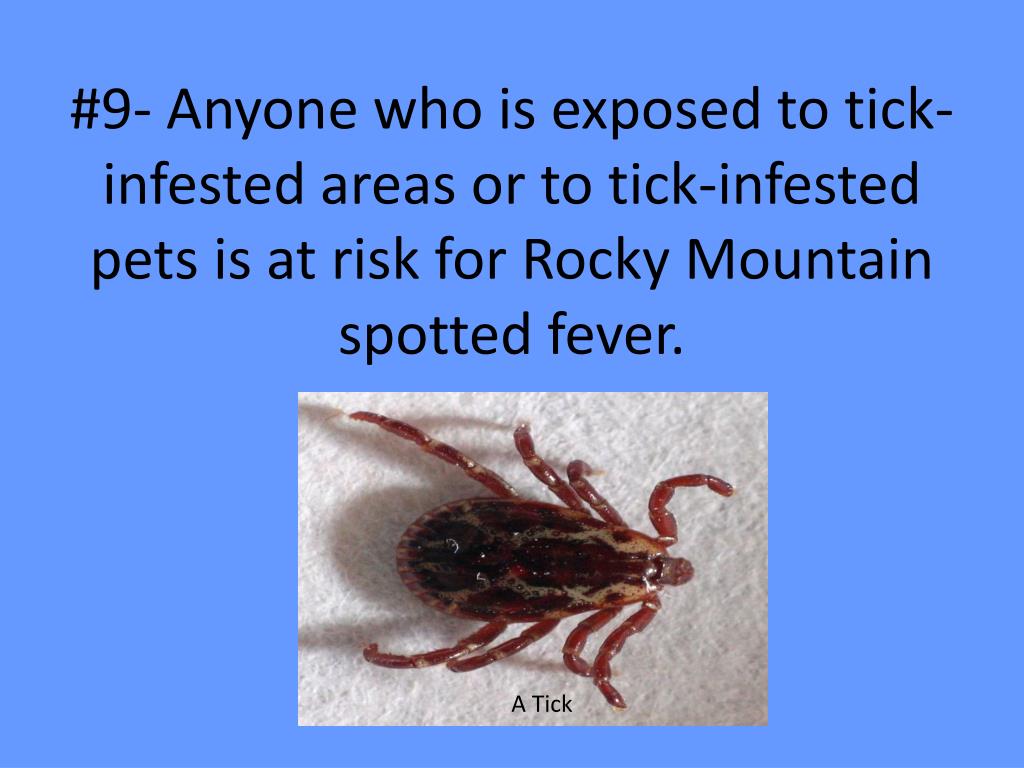 #9- Anyone who is exposed to tick-infested areas or to tick-infested pets is at risk for Rocky Mountain spotted fever. A Tick