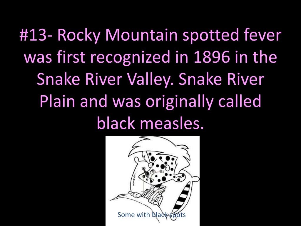 #13- Rocky Mountain spotted fever was first recognized in 1896 in the Snake River Valley. Snake River Plain and was originally called black measles. Some with black spots