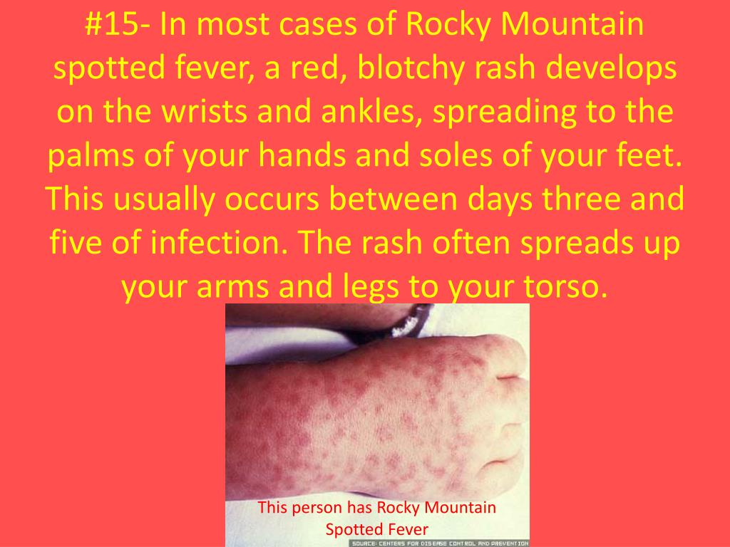 #15- In most cases of Rocky Mountain spotted fever, a red, blotchy rash develops on the wrists and ankles, spreading to the palms of your hands and soles of your feet. This usually occurs between days three and five of infection. The rash often spreads up your arms and legs to your torso. This person has Rocky Mountain Spotted Fever