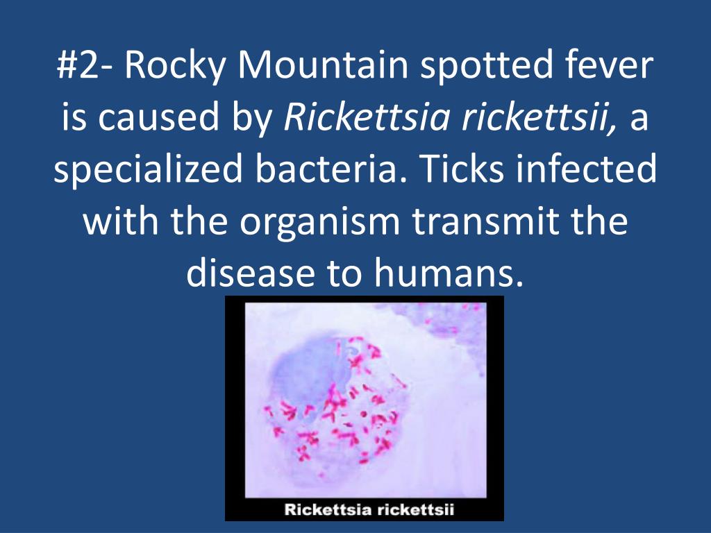 #2- Rocky Mountain spotted fever is caused by Rickettsiarickettsii, a specialized bacteria. Ticks infected with the organism transmit the disease to humans.