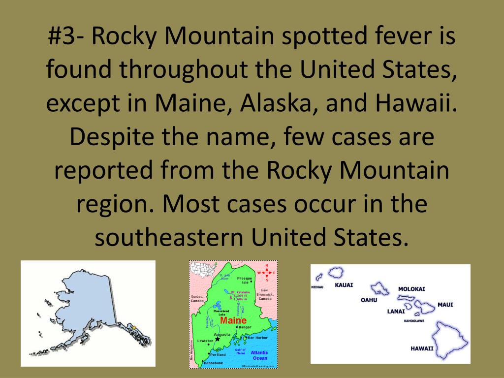 #3- Rocky Mountain spotted fever is found throughout the United States, except in Maine, Alaska, and Hawaii. Despite the name, few cases are reported from the Rocky Mountain region. Most cases occur in the southeastern United States.