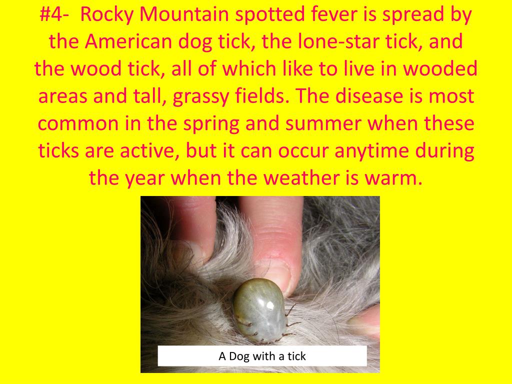 #4- Rocky Mountain spotted fever is spread by the American dog tick, the lone-star tick, and the wood tick, all of which like to live in wooded areas and tall, grassy fields. The disease is most common in the spring and summer when these ticks are active, but it can occur anytime during the year when the weather is warm. A Dog with a tick