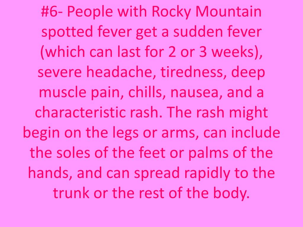 #6- People with Rocky Mountain spotted fever get a sudden fever (which can last for 2 or 3 weeks), severe headache, tiredness, deep muscle pain, chills, nausea, and a characteristic rash. The rash might begin on the legs or arms, can include the soles of the feet or palms of the hands, and can spread rapidly to the trunk or the rest of the body.