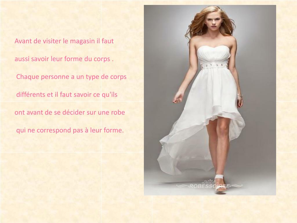 Avant de visiter le magasin il faut aussi savoir leur forme du corps . Chaque personne a un type de corps différents et il faut savoir ce qu'ils ont avant de se décider sur une robe qui ne correspond pas à leur forme.