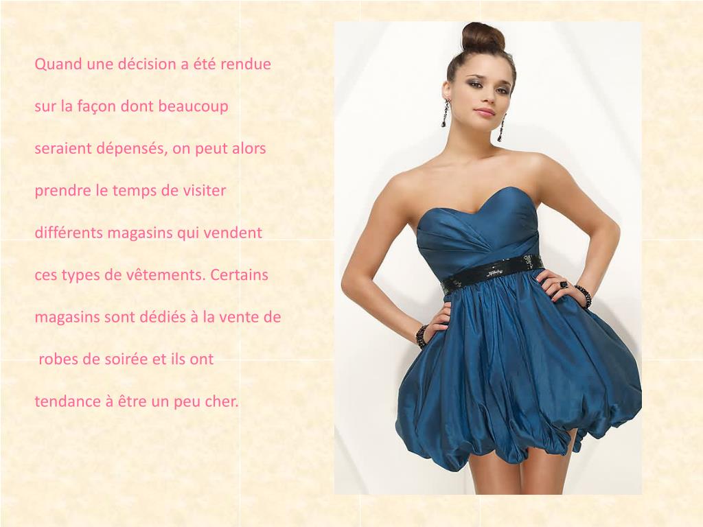 Quand une décision a été rendue sur la façon dont beaucoup seraient dépensés, on peut alors prendre le temps de visiter différents magasins qui vendent ces types de vêtements. Certains magasins sont dédiés à la vente de robes de soirée et ils ont tendance à être un peu cher.
