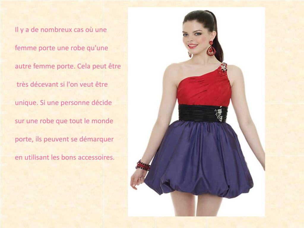 Il y a de nombreux cas où une femme porte une robe qu'une autre femme porte. Cela peut être très décevant si l'on veut être unique. Si une personne décide sur une robe que tout le monde porte, ils peuvent se démarquer en utilisant les bons accessoires.
