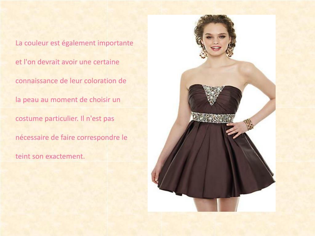 La couleur est également importante et l'on devrait avoir une certaine connaissance de leur coloration de la peau au moment de choisir un costume particulier. Il n'est pas nécessaire de faire correspondre le teint son exactement.