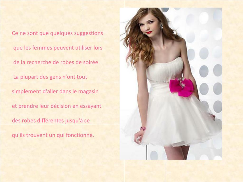 Ce ne sont que quelques suggestions que les femmes peuvent utiliser lors de la recherche de robes de soirée. La plupart des gens n'ont tout simplement d'aller dans le magasin et prendre leur décision en essayant des robes différentes jusqu'à ce qu'ils trouvent un qui fonctionne.