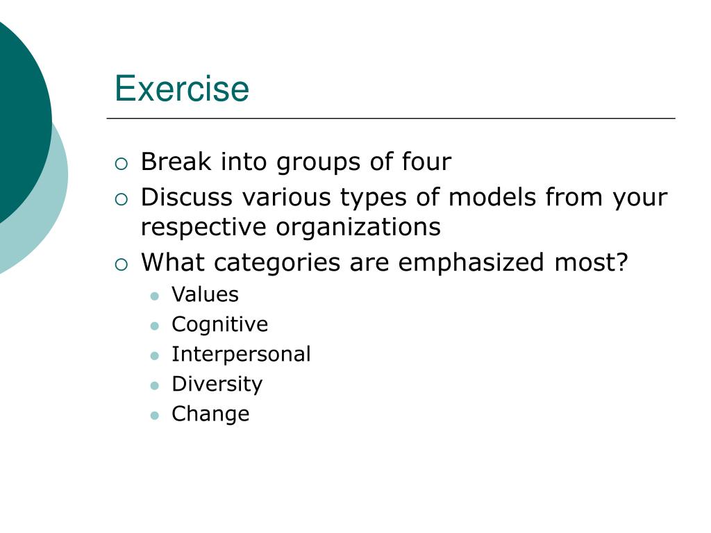 Exercise • Break into groups of four • Discuss various types of models from your respective organizations • What categories are emphasized most? • Values • Cognitive • Interpersonal • Diversity • Change