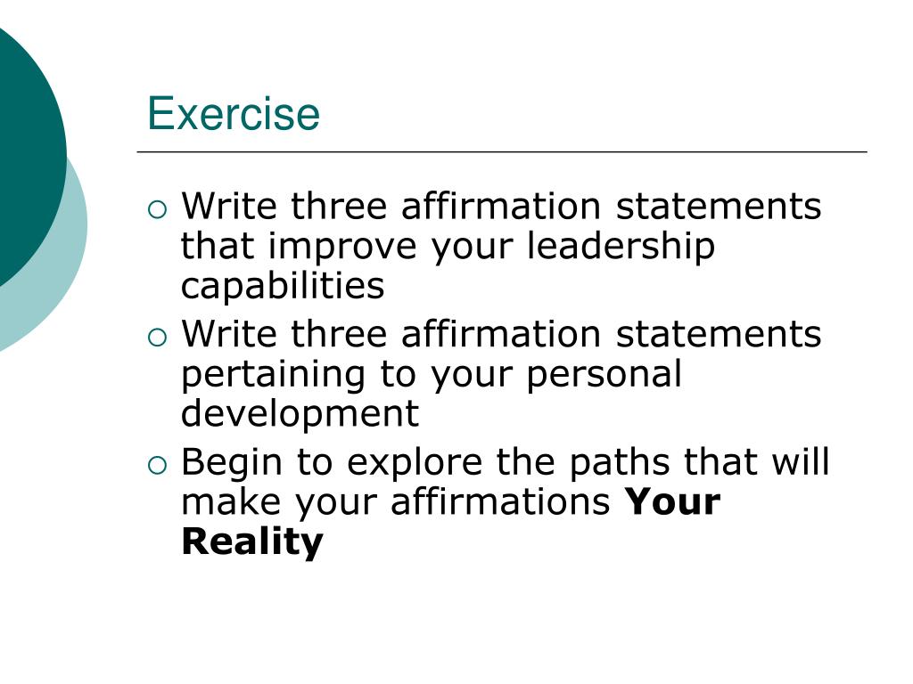 Exercise • Write three affirmation statements that improve your leadership capabilities • Write three affirmation statements pertaining to your personal development • Begin to explore the paths that will make your affirmations Your Reality