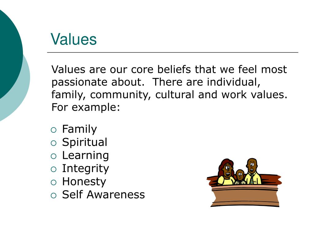 Values Values are our core beliefs that we feel most passionate about. There are individual, family, community, cultural and work values. For example: • Family • Spiritual • Learning • Integrity • Honesty • Self Awareness
