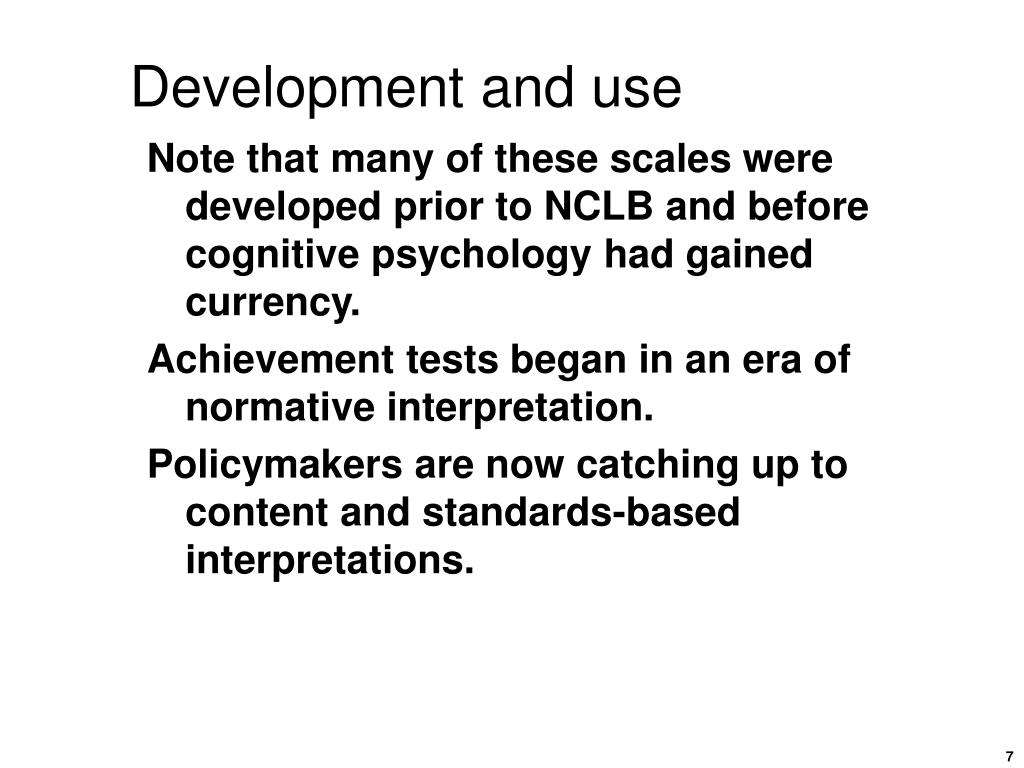 Development and use Note that many of these scales were developed prior to NCLB and before cognitive psychology had gained currency. Achievement tests began in an era of normative interpretation. Policymakers are now catching up to content and standards-based interpretations.