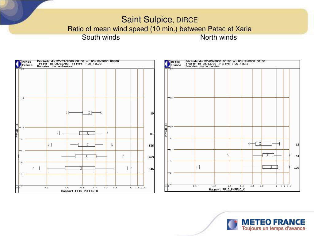 Saint Sulpice, DIRCERatio of mean wind speed (10 min.) between Patac et XariaSouth winds North winds